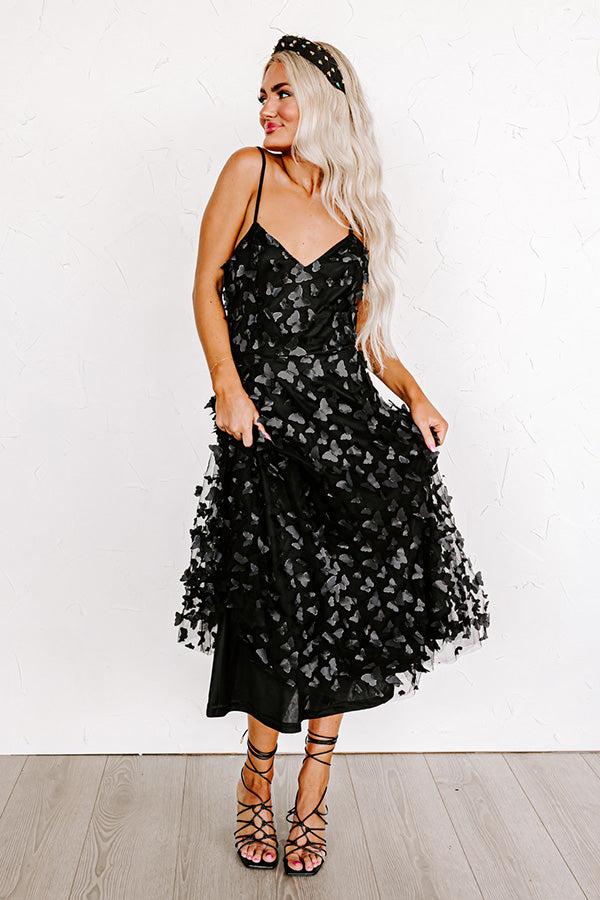 - This gorgeous dress will give you butterflies! - Fully lined 3D butterfly tulle material with shimmering accent throughout - A v-cut neckline - Adjustable spaghetti straps - Side zip closure - A figure flattering silhouette that ends in a straight midi length hemline