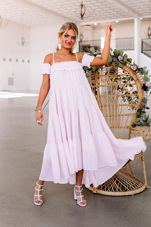 Twirl into your big day look effortlessly pretty in our pink 'Laguna Exclusive Maxi' dress featuring lightweight flowy material, a smocked neckline and drop sleeves, adjustable spaghetti straps, and a relaxed tiered silhouette that cascades beautifully into a straight ankle-length hemline!