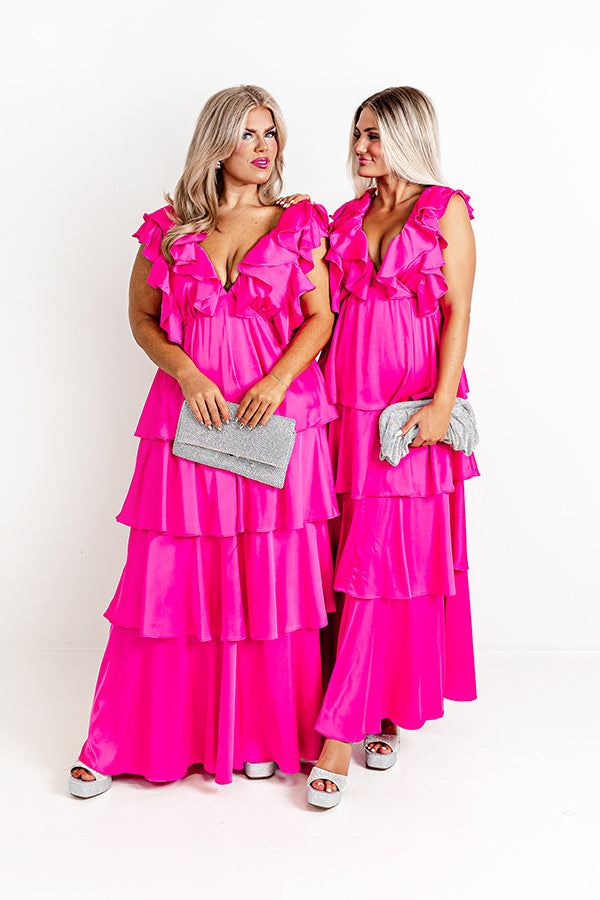 - A flowy tiered silhouette that ends in a maxi length hemline