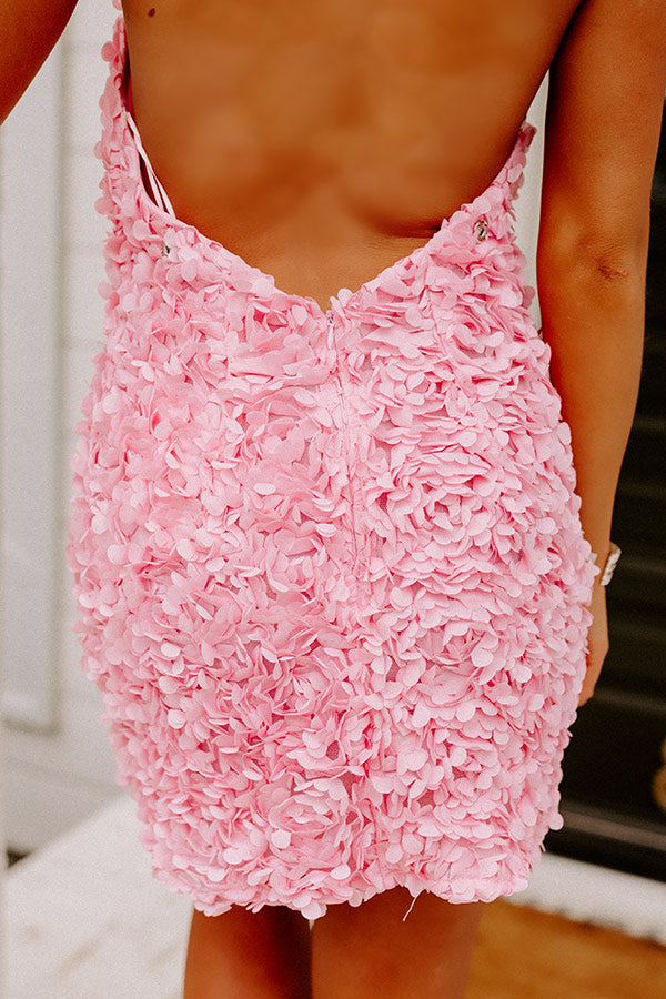 - This feminine dress stands out with romantic style! - Tulle petal material - A built-in sheer chiffon lining - A halter style neck with back hook and eye closure - An open back - Back zip closure - A large detachable statement bow on the back - A figure flattering silhouette that ends in a straight upper-thigh length hemline