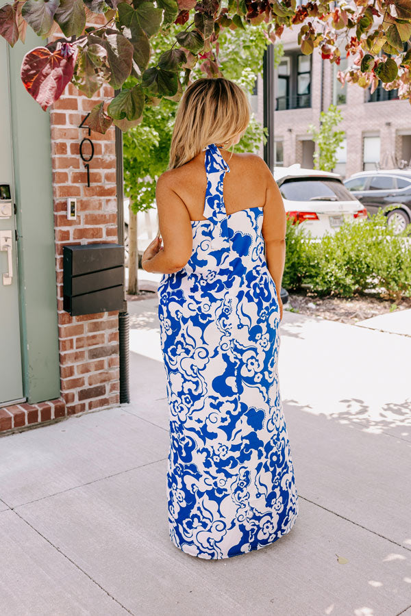 - This breezy dress will keep you stylish around the clock! - Fully lined lightweight material with a white and blue hued abstract print and a satin finish - A v-cut neckline with halter tie closure - An open back with - Back zip closure and a interior non-slip strip - A figure flattering silhouette that ends in a straight maxi length hemline with a front accent slit