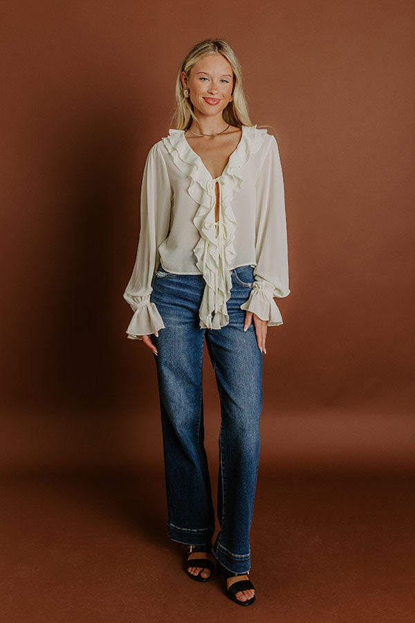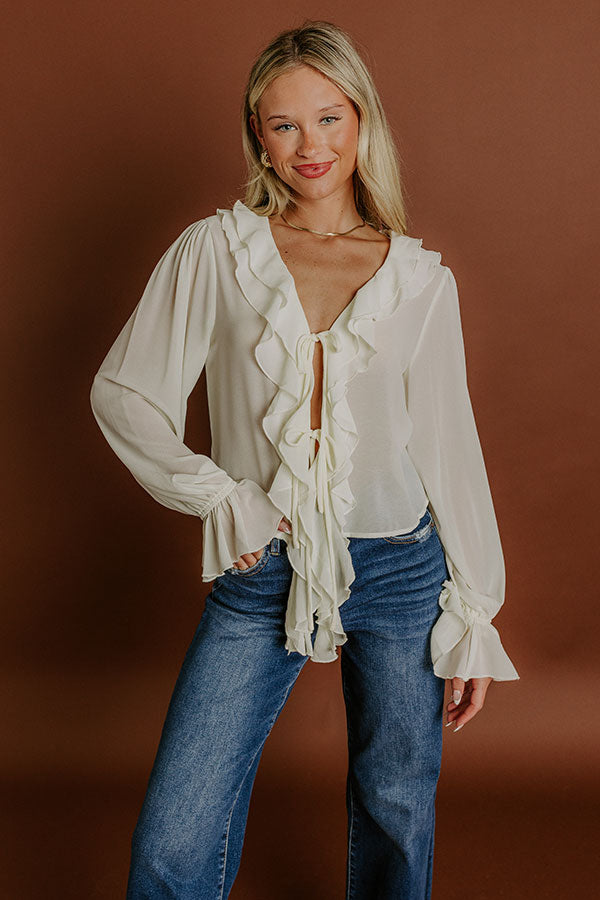- Feminine vibes meet effortless style with this fabulous front tie top! Its breezy material and frilly details make it a chic must for any stylish wardrobe.