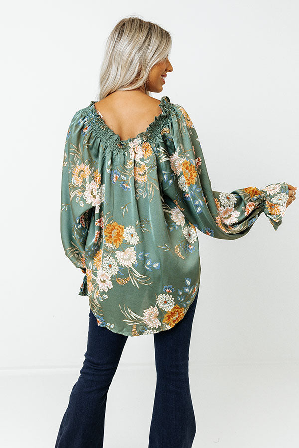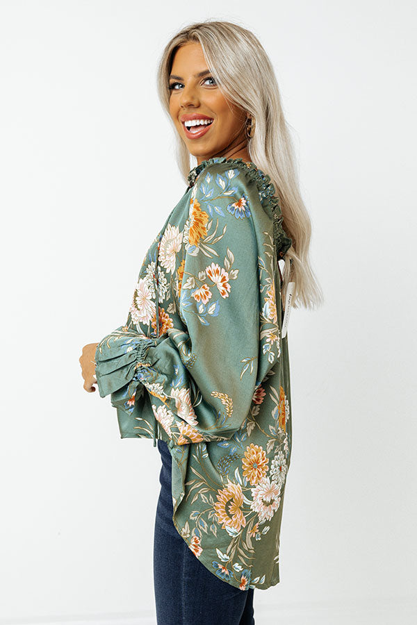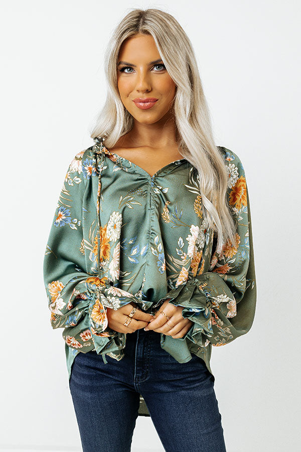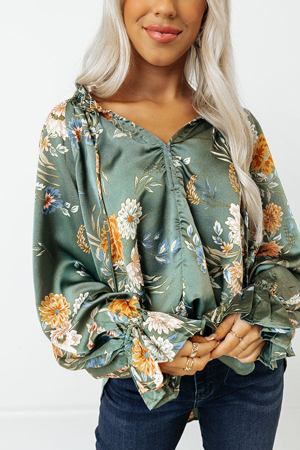 Arrive looking graceful and gorgeous in this beautiful pear hued shift top featuring lightweight material patterned with a mustard and cream hued floral print, a v-cut neckline with a tie closure and subtle ruffle trim detailing, long oversized sleeves with flared cuffs, and a relaxed silhouette that falls into a rounded hemline!