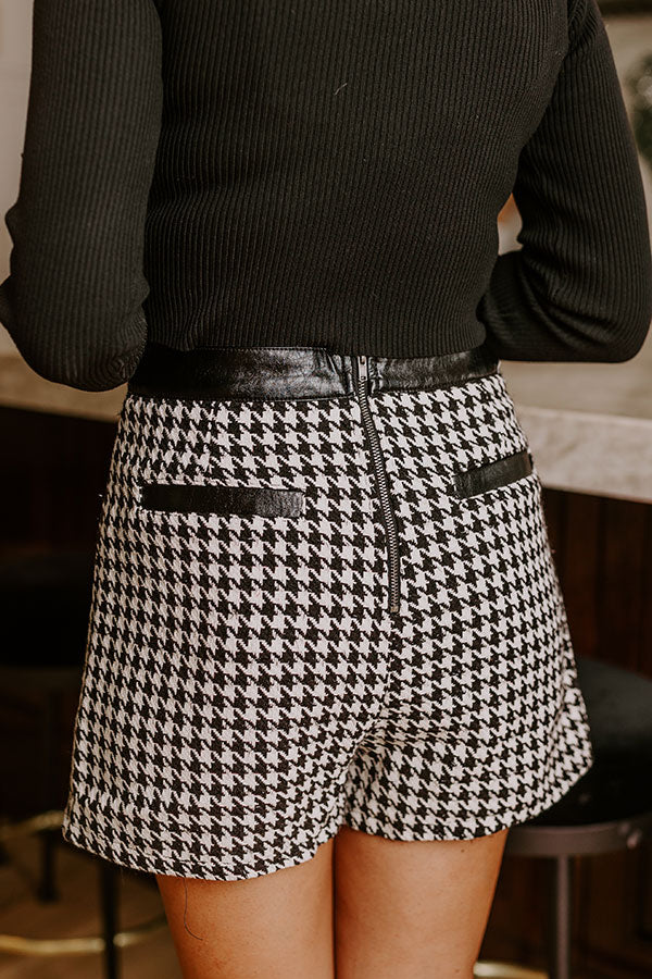 - Elevate your style with this fabulous houndstooth skort! Shimmering accents and faux leather details make it perfect for flirty, fashionable moments.