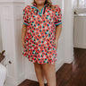 - Express your bubbly sense of style with this colorful mini dress! Its adorable floral print and trendy accent trim give it a unique look to keep you looking cute around the clock. - Cream colored material with an abstract floral print featuring red, coral, primrose yellow, and different green, and blue hues - A built-in lining - Espresso, pink, and jade colored accent trim with a stripe pattern - Short puff sleeves with an interior detail to create extra volume - A collared v-cut neckline - Functional low pockets on the front - A relaxed silhouette that ends in a straight hemline