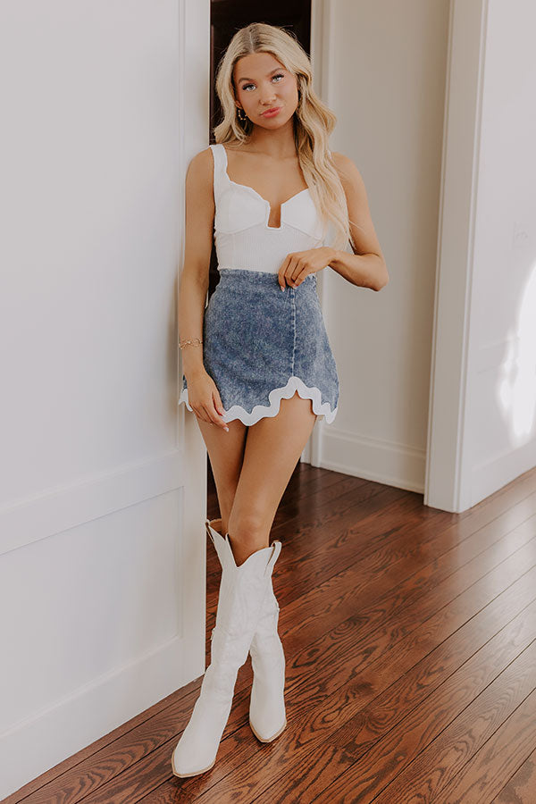 - A figure hugging skort silhouette that end in scalloped hemlines with a side slit accent and rick rack trim