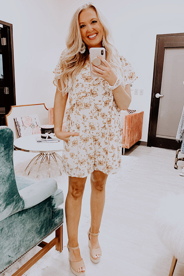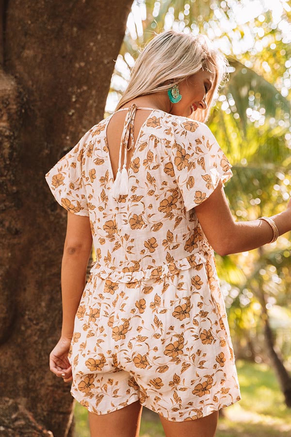 "Seas" the day in our adorable white "Costa Maya" romper featuring lightweight material patterned with a bold yellow hued floral print, a deep v-cut neckline and upper back with a tie closure, short loose sleeves, ruffled accent seam detailing, and a relaxed babydoll silhouette that falls into straight upper-thigh length hemlines! We have styled this unique piece with some neutral platform heels, but you can also wear it with "The Alaya Wedge in Golden Honey" and our "Champagne And Chic Faux Leather Crossbody in Camel!" Measurements