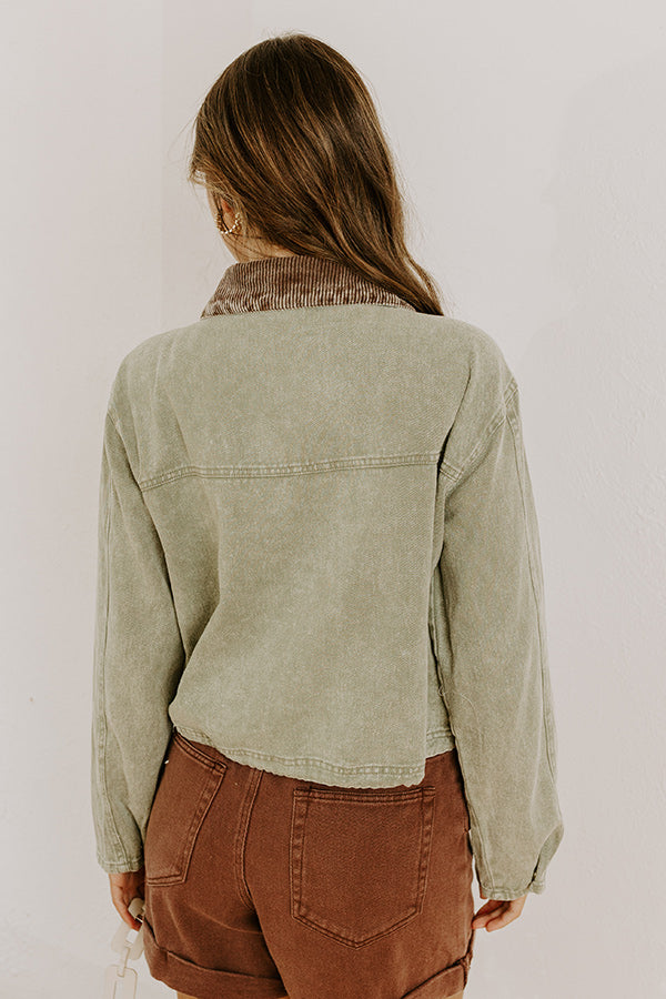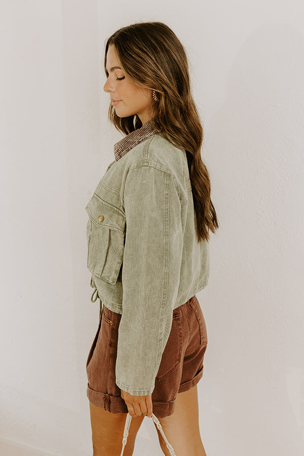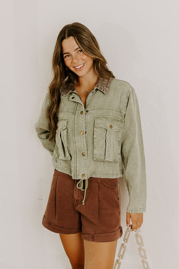 - Fall layers just got a stylish upgrade! This denim jacket brings effortless vibes with its drawstring hem and cool corduroy touches. - Unlined denim material with a vintage wash - A hazelnut colored corduroy collared neckline - Hidden zip closure as well as a button closure - Functional chest pockets - Long sleeves with a single snap at the cuff - A relaxed silhouette that ends in a straight hemline with a functional drawstring that ties in the front