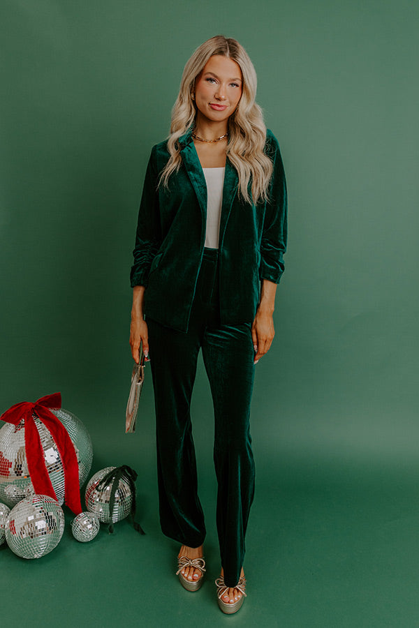 You are sure to influence people with your chic style when you complete your look with this fabulous hunter green blazer featuring soft lightweight velvet material, 3/4-length sleeves with button detailing, a flap collar neckline, low accent pockets with flap closures, and a flattering open front silhouette that ends in a straight hemline!
