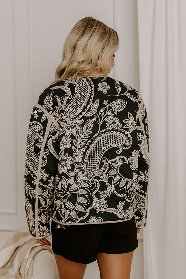 - Bundle up in style with this darling floral quilted jacket! Perfect for breezy days and all your on-the-go adventures. - Fully lined quilted material featuring an oatmeal colored abstract floral print - A round neckline - A buttoned front - Long, loose sleeves - Functional front pockets - A relaxed silhouette that ends in a straight hemline