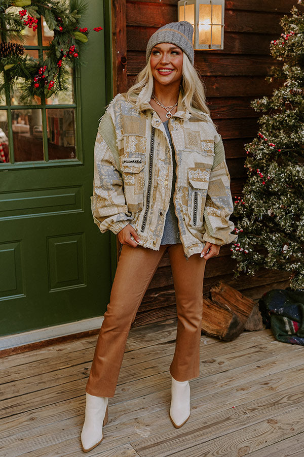 - Unlined denim material with frayed seam detail and waffle knit accents