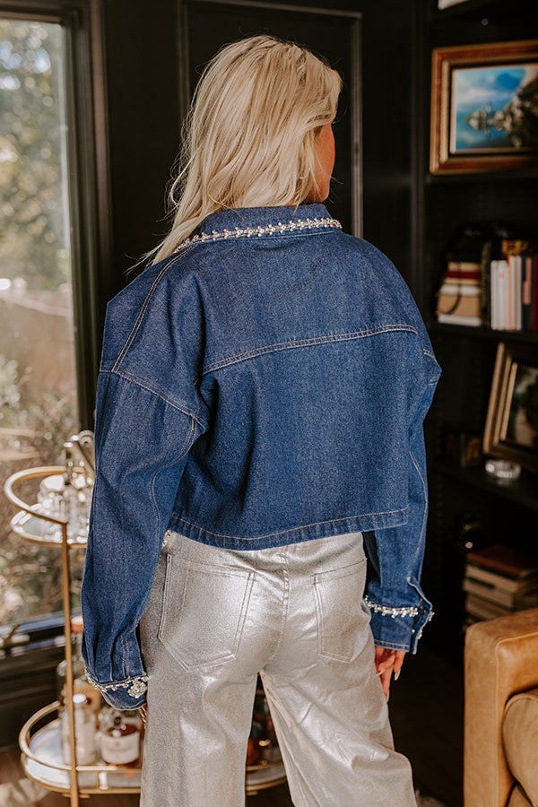 - Feel totally fab in this darling denim jacket! The sparkling rhinestones add the cutest touch of glam to its timeless style. Pop it over a casual look for a little sparkle, or pair it with a dress for a sweet, elevated vibe.