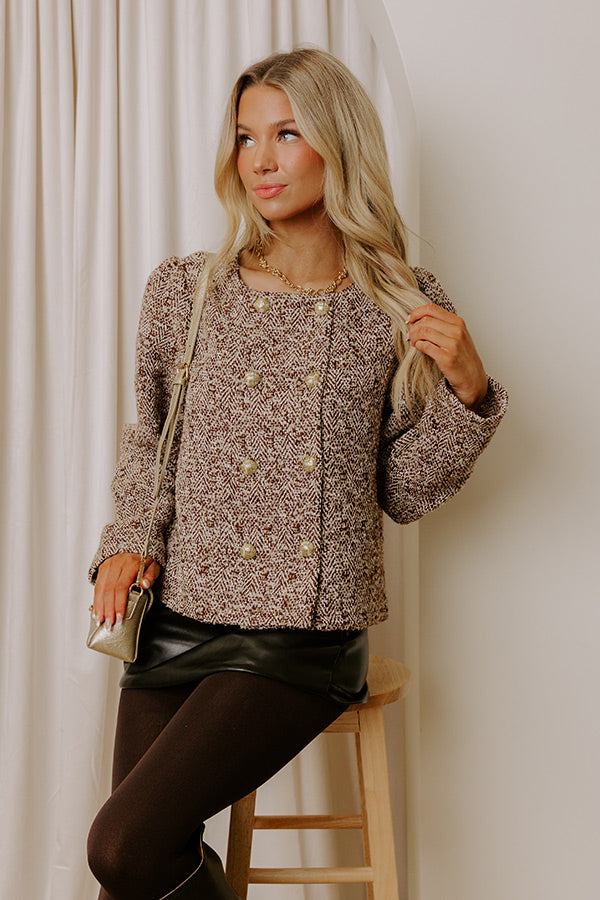 - Add timeless sophistication to your wardrobe with this chic tweed jacket! A must-have piece for polished, elevated looks. - Unlined tweed material featuring white, iced latte, and a brown hue - A round neckline - A buttoned front featuring gold-toned buttons - Long sleeves - A relaxed silhouette that ends in a straight hemline