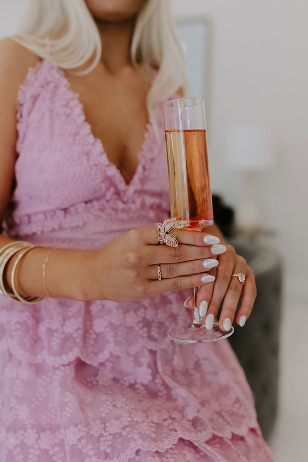 - Let your style take flight with this darling ring! - Gold ring with butterfly design adorned with beautiful pink, lavender, and clear rhinestones - Ring Size: 7 - Ring has an adjustable band