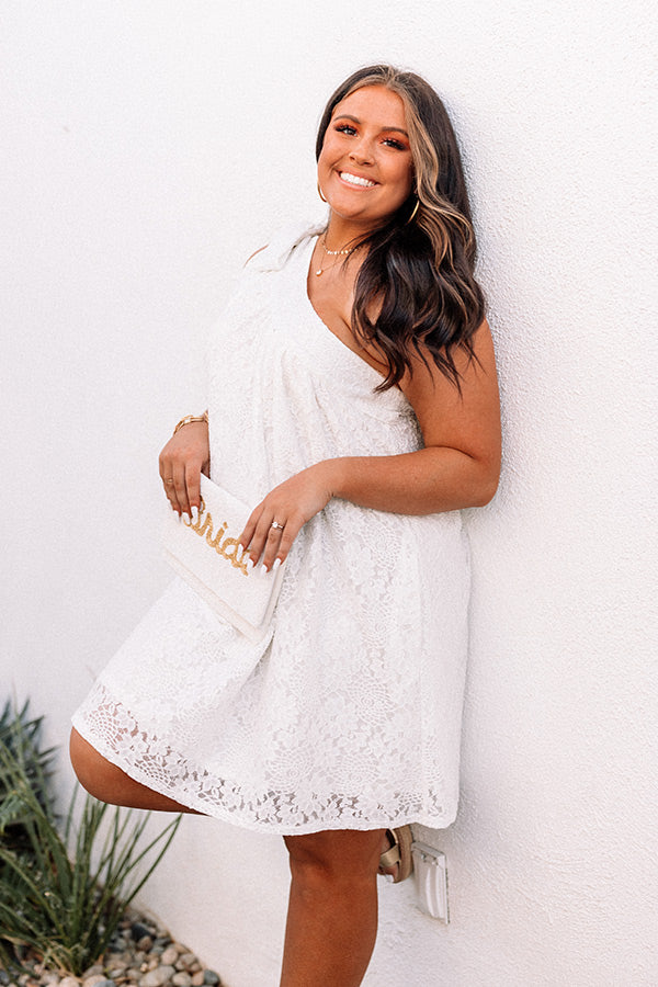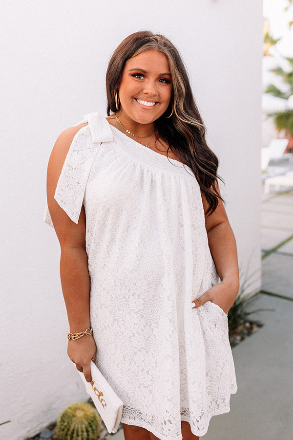 We have no doubt you'll want this adorable little white plus size dress to be yours forever with its delicate lace material, subtle glitter detailing, a diagonal neckline and upper back with a singe tie closure shoulder strap, hidden side pockets, and a relaxed silhouette that falls into a straight mid-thigh length hemline!