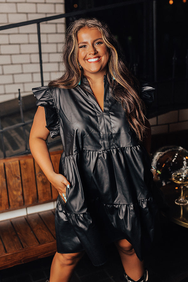 You won't find a better piece to wear to a concert than this edgy black plus size dress featuring faux leather material, a v-cut neckline, ruffled cap sleeves, hidden side pockets, and a relaxed tiered skirt silhouette that falls into a straight mid-thigh length hemline!