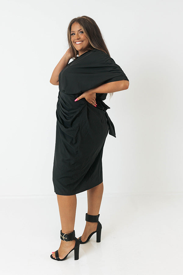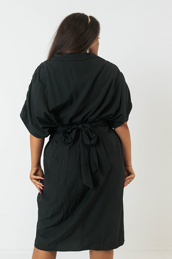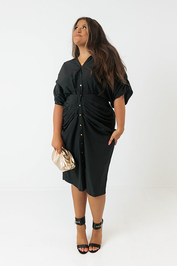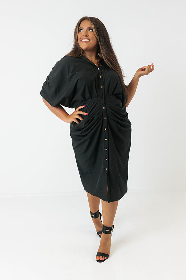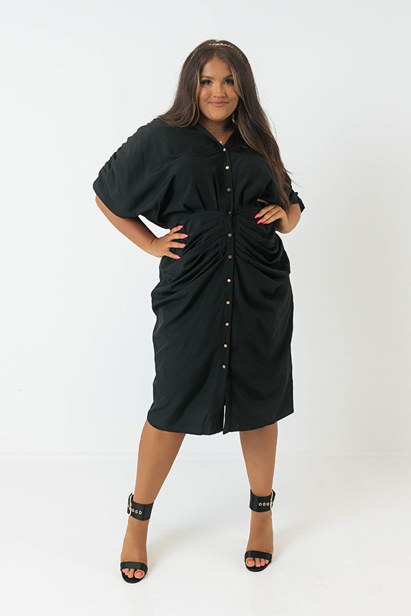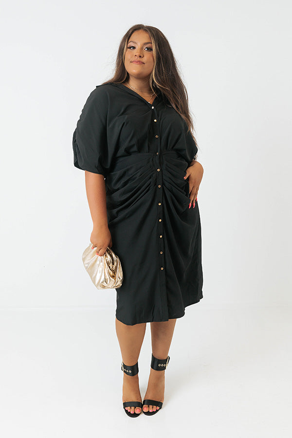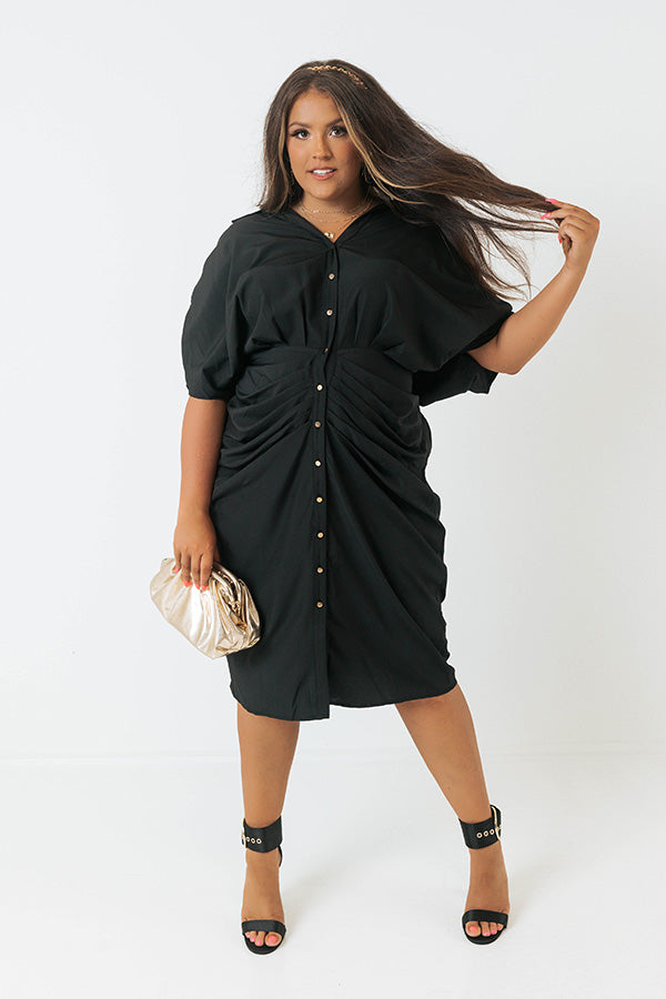 Make an entrance in our chic black plus size 'Delta Nights Midi' dress featuring lightweight material with ruched detailing down both sides, a button down front with a v-cut neckline, loose short sleeves with ruched detailing down the outside, a cinched waistline with a tie back closure, and a flattering silhouette that ends in a straight mid-thigh length hemline!