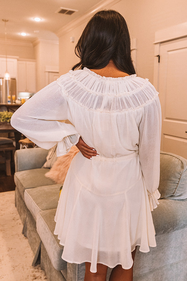 We won't be surprised if you confess how much you love this ivory hued shift dress! It features ultra lightweight breezy material, dainty pleated detailing across the shoulders with exposed ruffle accent seams, a v-cut neckline, long bishop sleeves with flared cuffs, a cinched tie belt waistline, and a relaxed silhouette that falls into an uneven mid-thigh length hemline! Measurements
