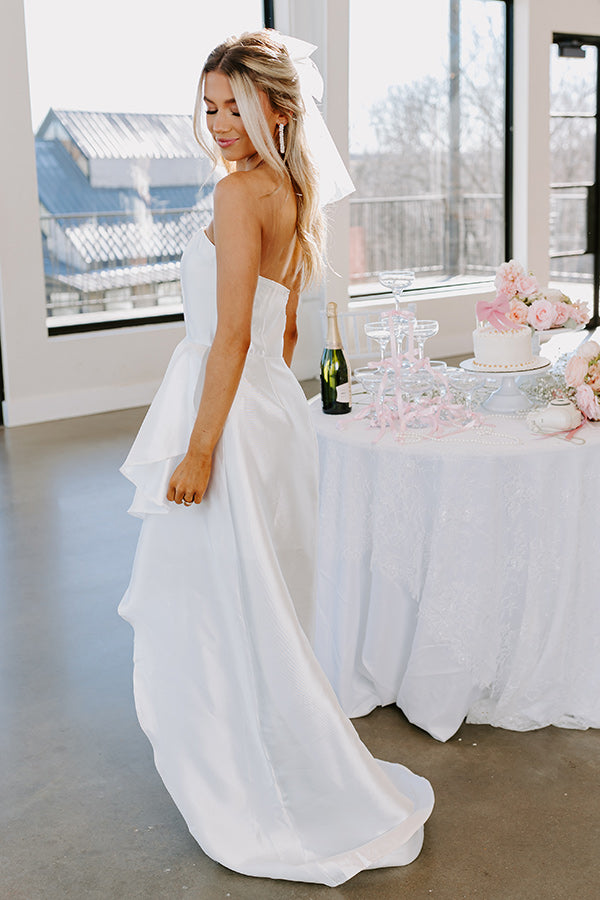 - Look lovely walking down the aisle in this fabulous dress! - Satin material - A partial lining that ends at thigh length - A strapless cut - An uneven neckline with and interior non-slip strip - Back zip closure - A bodice with pleated detail and structured boning - A flattering silhouette that ends in an uneven hemline with a front silt accent