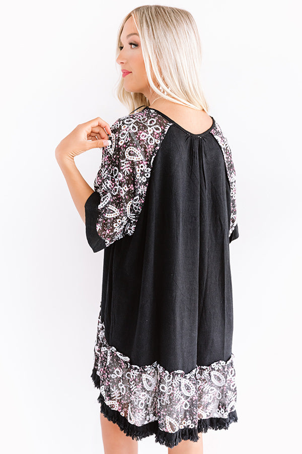 Dance your way through summer in style with our charming black "Parisian Party" shift dress featuring lightweight breezy material, intricate floral print accents with eyelet detailing, a high rounded neckline, short loose half sleeves with rolled cuffs, and an ultra relaxed silhouette that falls into a ruffled tunic length hemline! We have paired this versatile piece with a white mule heel and faux leather tote, but you can also wear it front tucked into some distressed denim shorts, "The Rosella Wedge in Black," and our "Surf Shack Hat in Ivory!" Measurements