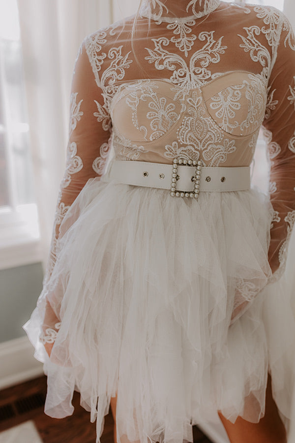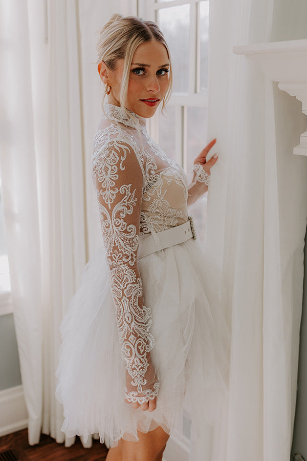 - Make a stunning entrance with this gorgeous mini dress! Delicate lace embroidery and long, sheer sleeves make this piece perfect for creating a captivating look you are sure to fall in love with.