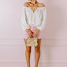 You will look like the ultimate boss babe in this chic white shift top featuring sleek lightweight material, a wide tie closure v-cut neckline that can be worn on- or off-shoulder, loose 3/4-length sleeves, and a slouched silhouette that falls into a straight hemline!