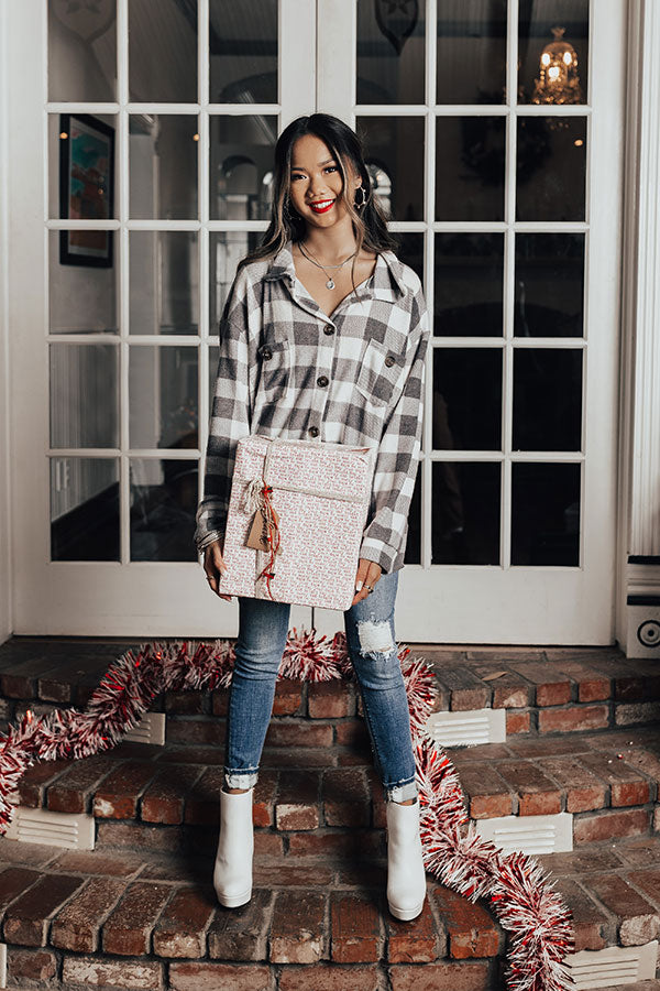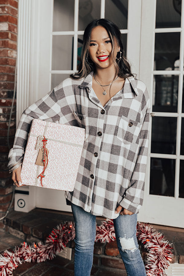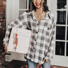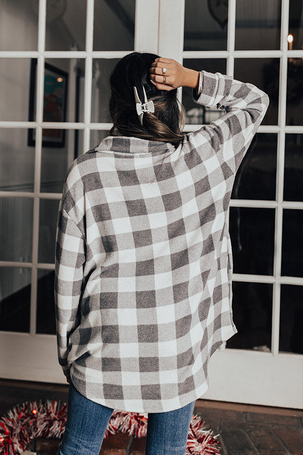 Keep your look casual but cute in our trendy 'Need You Opinion' top featuring soft material patterned with a white and grey checkered print, a button down front with a collared neckline, long loose sleeves with button closure cuffs, two accent chest pockets and hidden side pockets, and a relaxed silhouette that falls into a rounded hemline!