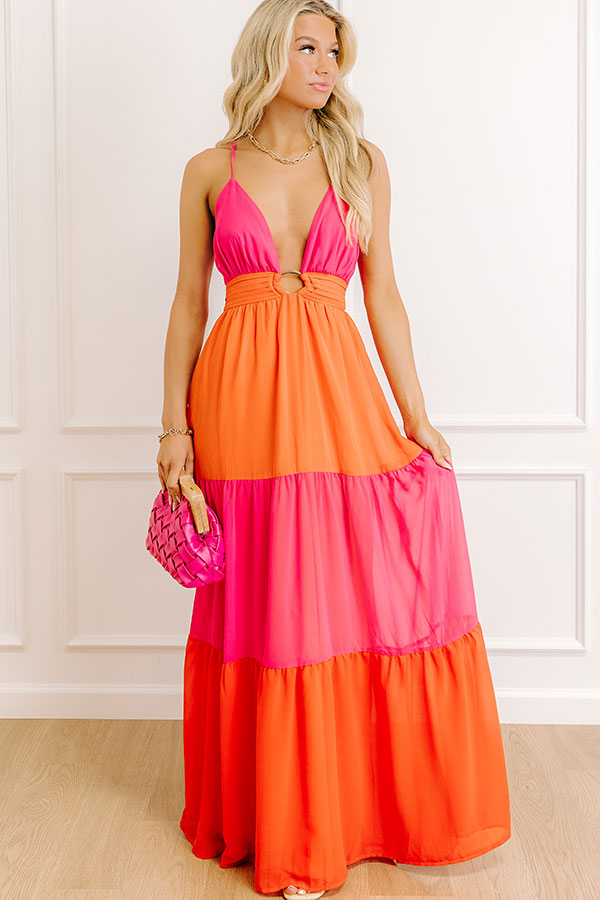 - Fully lined chiffon material with a colorblock pattern featuring shades of pink and orange