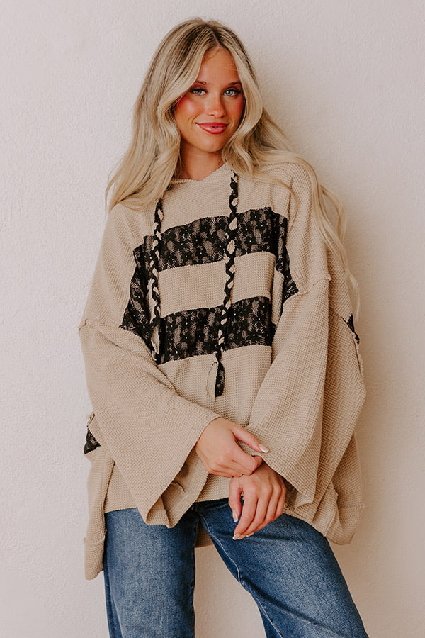 - Make easy-going days even more stylish with this darling knit hoodie! Cute floral lace and a braided drawstring add trendy detail to this everyday favorite. - Unlined knit material featuring wide, black colored floral lace stripes - A hood at the neckline featuring a functional braided drawstring - Long, loose sleeves with drop shoulders - Unfinished seam accents - A relaxed silhouette that ends in a straight hemline