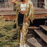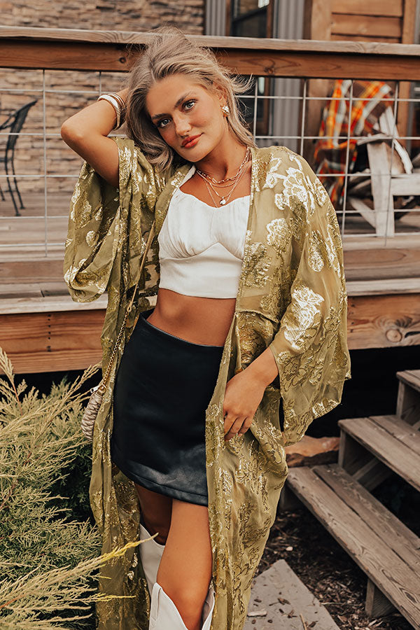 - Keep all eyes on you with this gorgeous floral duster! With a shimmering pattern and a flowy silhouette, this piece is sure to keep you in the spotlight.