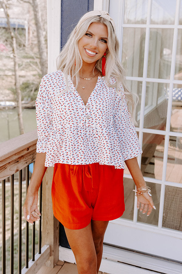 Sweeten up your summer wardrobe with this charming white top featuring lightweight material patterned with tiny red and navy cherries, a two button up bodice with a v-cut neckline, loose half sleeves, and a relaxed silhouette that ends in a straight peplum hemline! on products