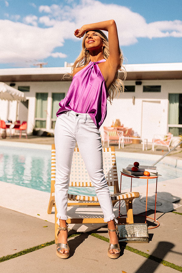 Get ready to party, summer's almost here! This flirty orchid colored top featuring lightweight satin material, a twisted front and back neckline with a sleeveless fit, and a relaxed silhouette that falls into a straight hemline!