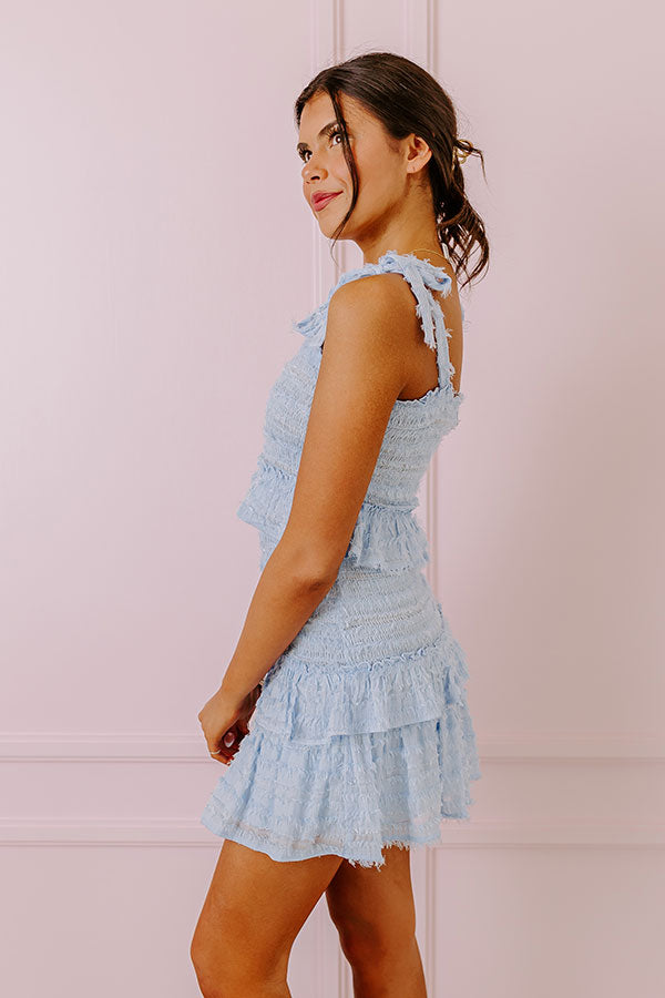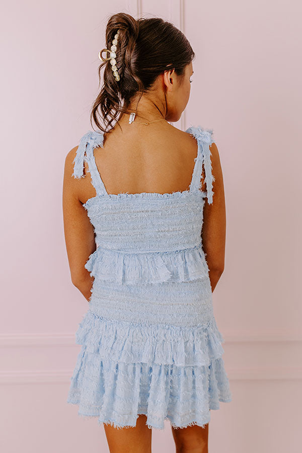 - Turn heads with your unique style with this flirty dress! - Unlined, semi-sheer eyelash material - A ruffled scoop neckline - 1-inch tie closure straps - A smocked bodice and upper skirt - Ruffled accents - A figure hugging silhouette that ends in a ruffle mini dress length hemline