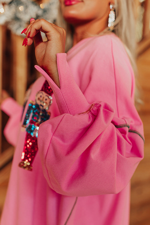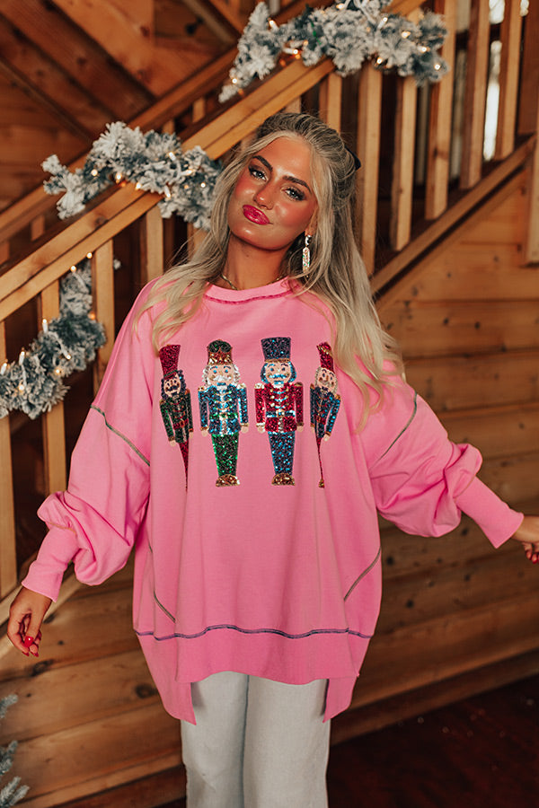 - A shimmering sequined red, green, blue, and gold nutcracker design on the front