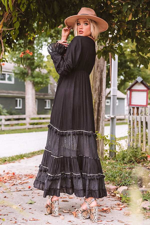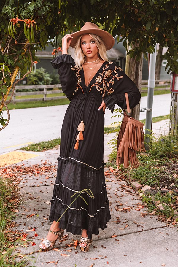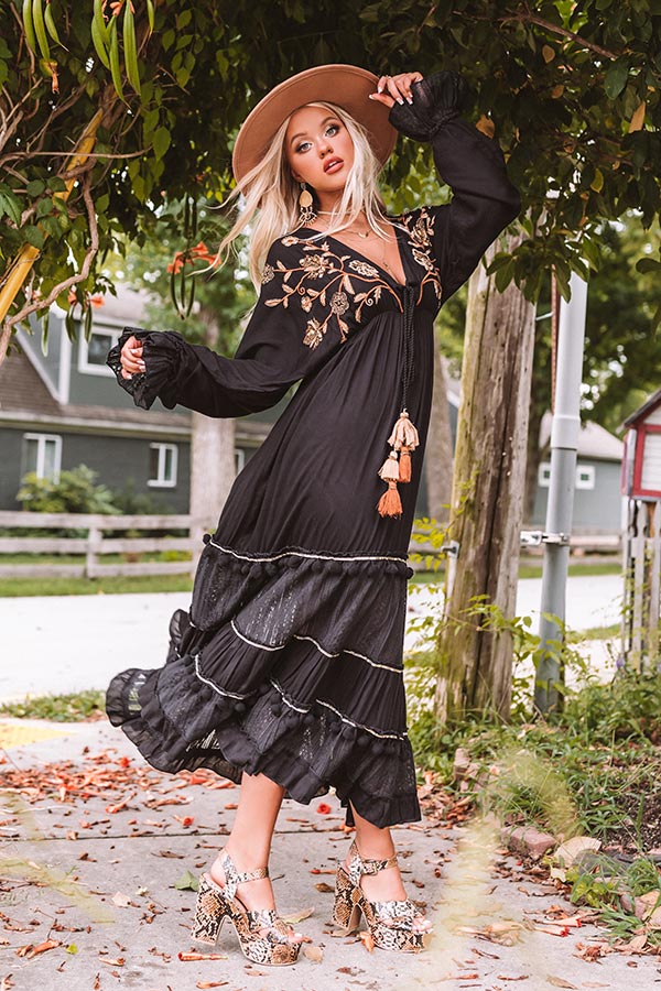 You will look like a dream in this pretty black maxi dress featuring lightweight breezy material with stunning embellished floral detailing, a deep v-cut neckline with a tassel tie closure, long loose bishop sleeves with flared cuffs, an ultra relaxed tiered silhouette with tassel accent seams, and an uneven floor-length hemline! We have styled this gorgeous piece with some snake print platform heels and a brown wool hat and fringe tote, but you can also wear it with "The Sydney Wedge in Gold!" Measurements