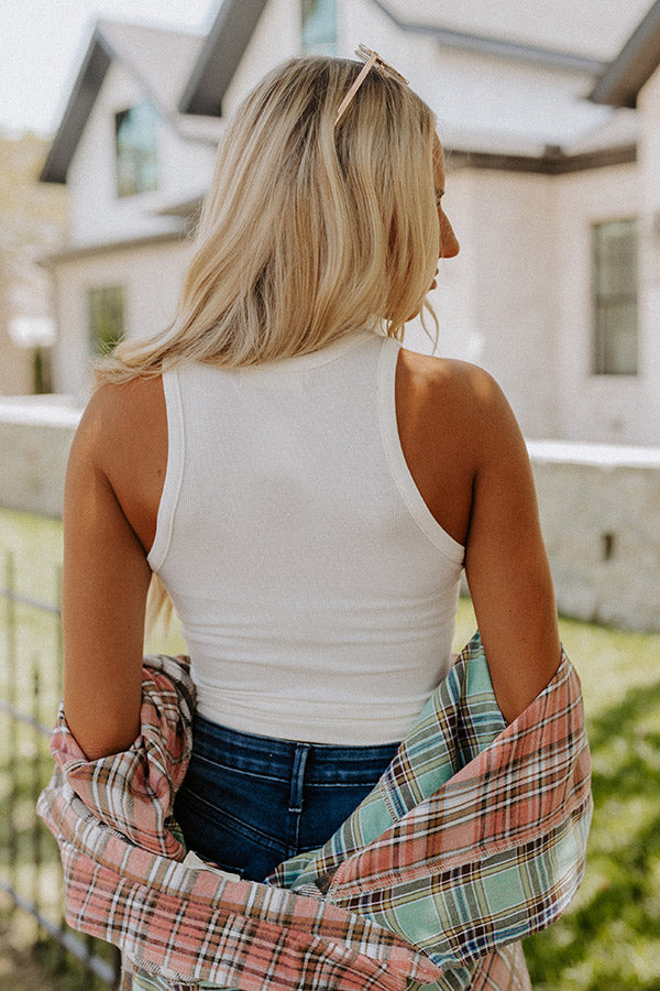 Keep your look simple but versatile in our basic ivory colored 'Calmer Days' tank featuring lightweight four-way stretch material with subtle vertical ribbed texturing, a rounded neckline, 1-inch sleeveless shoulder straps with a racerback fit, and a flattering figure hugging silhouette that ends a straight hemline! on products