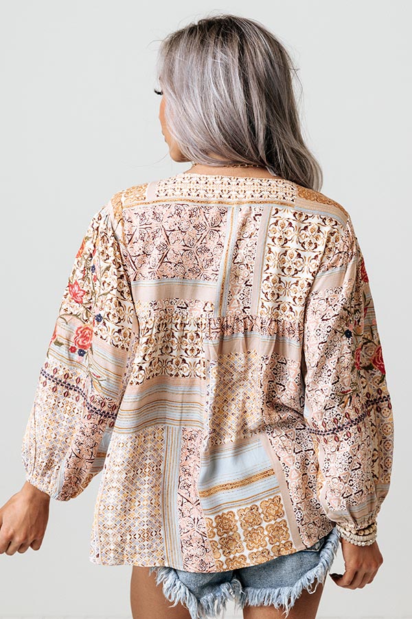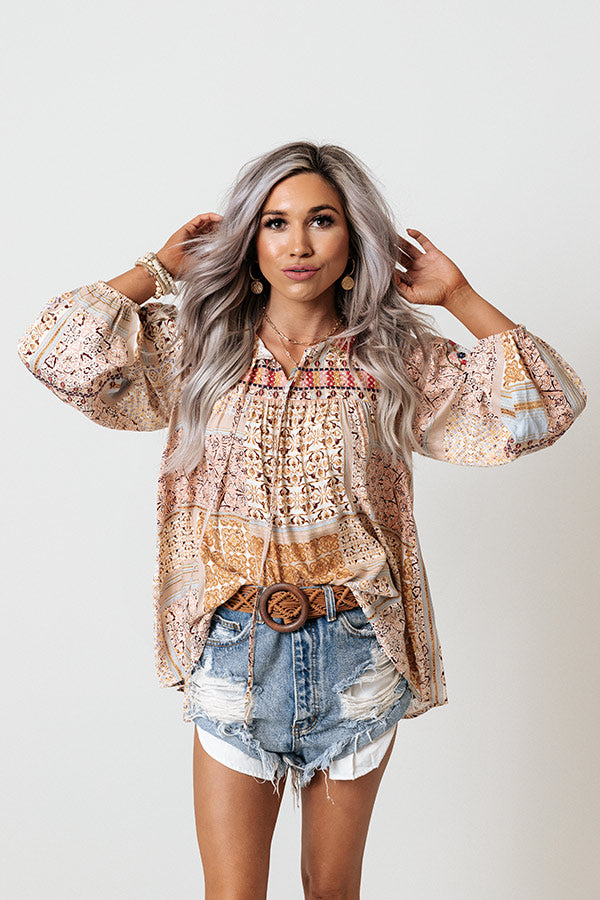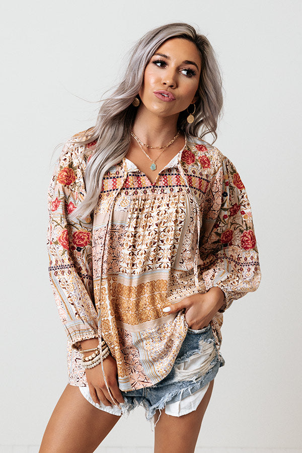Slay all day in our charming 'Focus On Love' shift top featuring lightweight flowy material patterned with various intricate prints, a v-cut neckline with a tie closure, long bubble sleeves with elastic band cuffs, and a relaxed silhouette that falls into a rounded hemline!