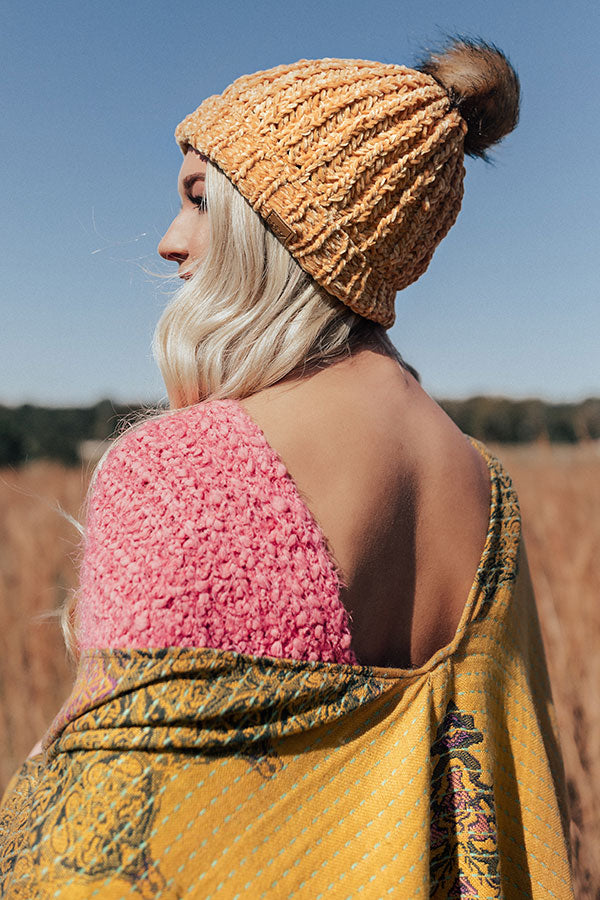 This golden honey colored beanie is "pure sweetness" with its soft loose knit chenille material with large texturing, fleece lining, a rolled hemline, and a faux fur pom pom accent!