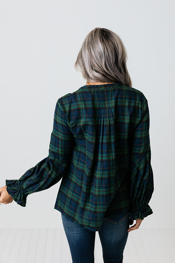 People are sure to glance your way when you complete your look with this sweet navy colored top featuring lightweight material patterned with a green plaid print, a v-cut neckline, long bishop sleeves with flared cuffs, and a relaxed babydoll silhouette that falls into a straight hemline!