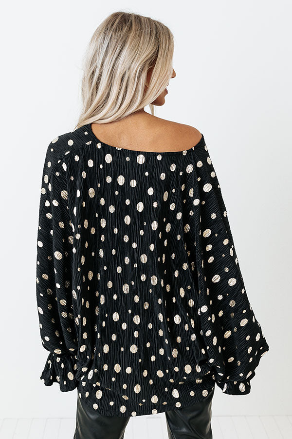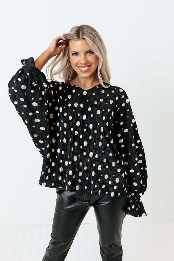 Don't hesitate to add our darling black 'Sweeter With Time' shift top to your cart with its lightweight material, small polka dot print, v-cut neckline, long oversized bishop sleeves with flared cuffs, and relaxed silhouette that falls into a straight hemline!
