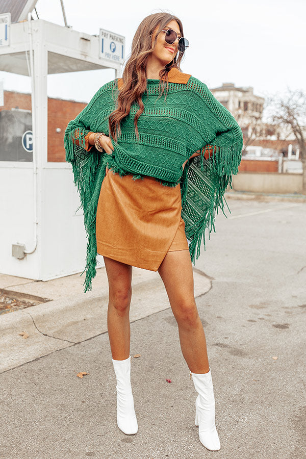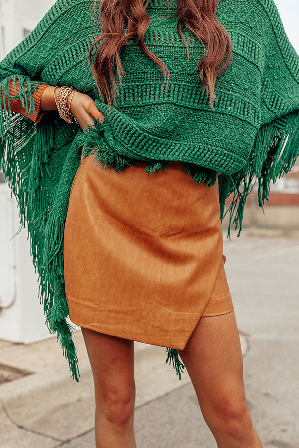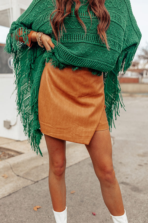 Transition from season to season with ease in our chic camel hued 'Fabina' skirt featuring sleek faux leather material, a zip closure back, and a faux wrap front with an asymmetrical mid-thigh length hemline!