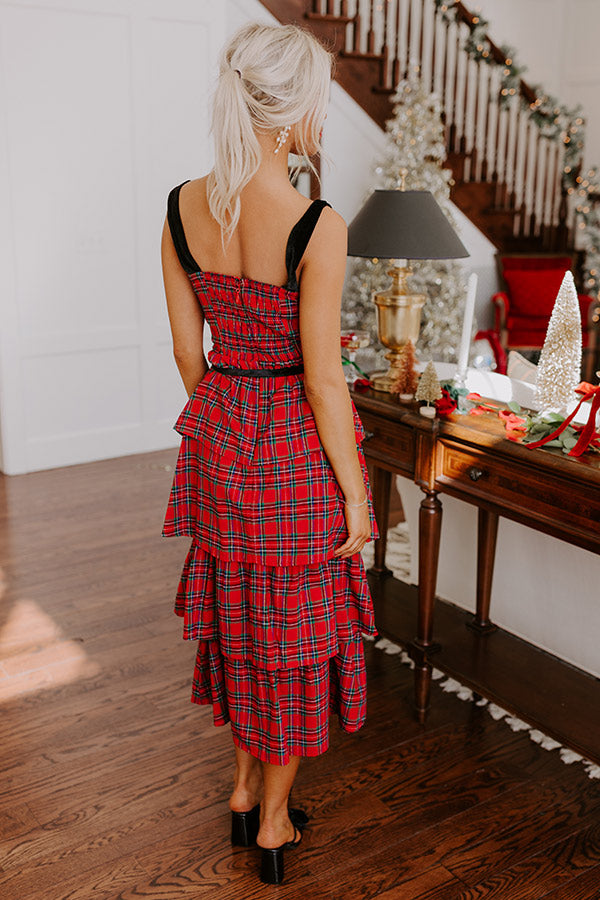- Embrace plaid season in this adorable tiered midi dress! Featuring charming velvet accents, this stylish piece is perfect for staying chic and festive all season long.