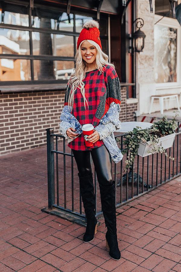 This adorable sweatshirt is sure to put off a sweet demeanor with its soft lightweight material patterned with a black and red checkered print, a high rounded neckline, long oversized sleeves with fitted cuffs and red and grey ribbed accent panels around the upper arm, and a slouched silhouette that ends in a rounded hemline!