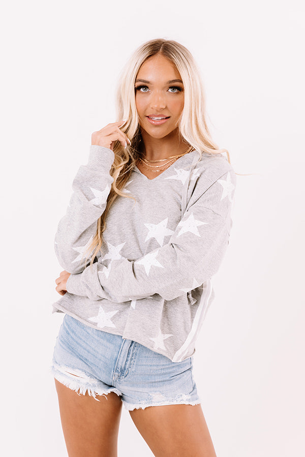 You won't have to wish upon a star for an adorable hoodie when you add this grey cutie to your cart with its soft lightweight material, large white star pattern, v-cut neckline with a drawstring hooded back, long loose sleeves with fitted cuffs, and a relaxed silhouette that falls into a straight raw cut hemline!