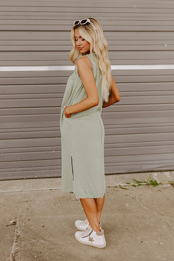 - A relaxed silhouette that ends in a midi length hemline with side slit accent