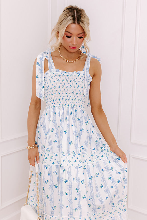 - This sweet maxi dress is a perfect mix of effortless charm and playful elegance. With its adorable floral print, tied straps, and a smocked bodice that fits like a dream, it's perfect for sunny moments when you just want to twirl around and feel fabulous.