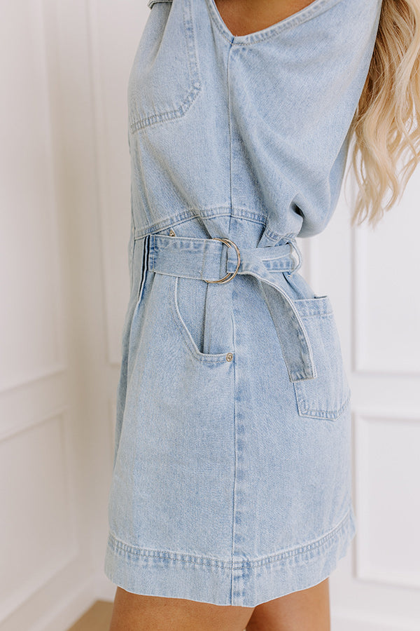 - Casual, chic, and ready to shine! This fabulous denim mini dress has all the trendy details to keep you looking like the main character. From its cinched waistline to its flirty v-cut neckline, this cutie is full of style. - Unlined denim material - A collared v-cut neckline - A sleeveless cut - Functional chest pockets - Pleated accents on the front of the skirt and upper back - A buttoned front ending below the waistline - A waist cinching detail on the back of the waistline and buckles at each side - Belt loops on the back of the waistline - Functional front and back pockets - A relaxed yet flattering silhouette that ends in a straight mini dress length hemline