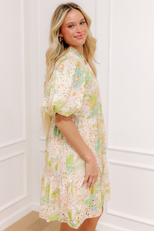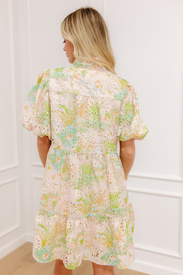 - Make a graceful entrance in this sweet mini dress! With floral eyelet fabric and sweet puff sleeves, this dress adds a playful, springtime energy to your look.