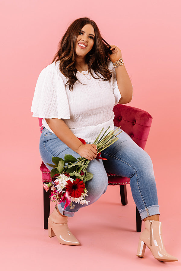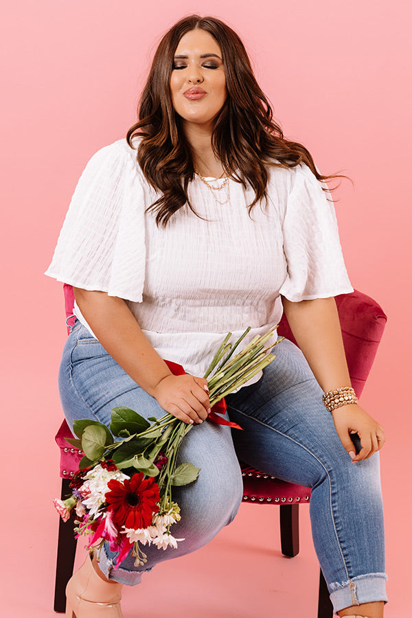 Plus Size - Arrive in style with our adorable white 'Countryside Drive Shift Top' featuring lightweight material with subtle texturing, a high rounded neckline, loose draped sleeves, a keyhole accented upper back with a button closure, and a figure flattering silhouette that falls into a rounded hemline!