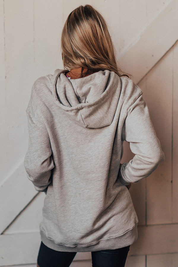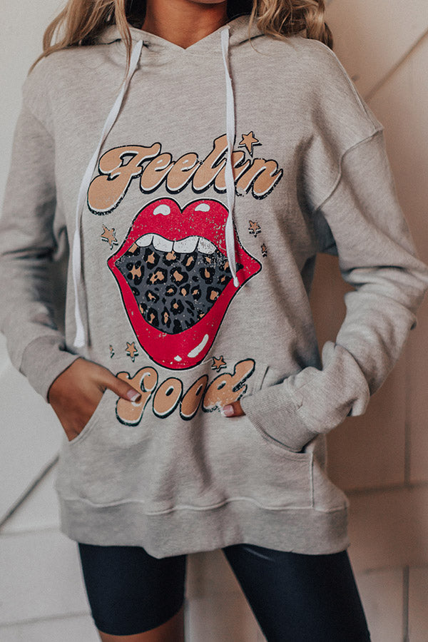 You will undoubtedly be "feelin' good" when you wear this light grey hoodie featuring soft lightweight material, a high rounded neckline, a hooded back with a draw string closure, long loose sleeves with fitted cuffs, a large kangaroo front pouch, an adorable leopard and lips front graphic, and a relaxed silhouette that falls into a straight tunic length hemline! You can dress this adorable piece down with some biker shorts and trendy sneakers, or you can style it up by wearing it with some distressed light wash ankle skinnies, our red "Hadid Faux Suede Bootie," our red "Going On Tour Wool Hat," and "The Real Deal Faux Leather Tote in Tan!"